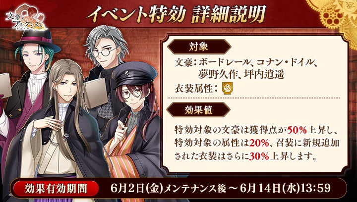 期間中「坪内逍遥」「ボードレール」「コナン・ドイル」「夢野久作」の衣装を編成して潜書すると、得点の獲得数がそれぞれ50%上昇します。また、「土」属性の衣装を編成して潜書すると、得点の獲得数がそれぞれ20%上昇します。