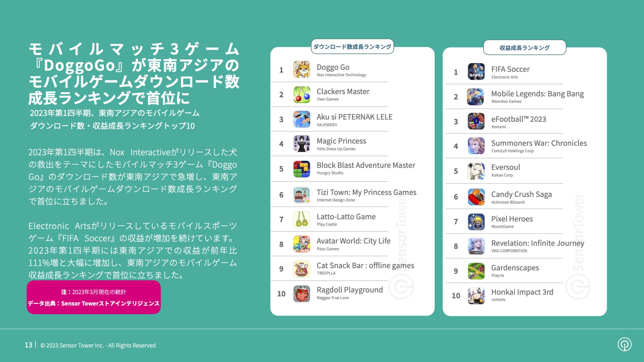 2023年第1四半期には、犬の救出がテーマのNox Interactiveが配信するモバイルマッチ3ゲーム『Doggo Go』のダウンロード数が東南アジアで急増加し、ダウンロード数成長ランキングで首位に立ちました。