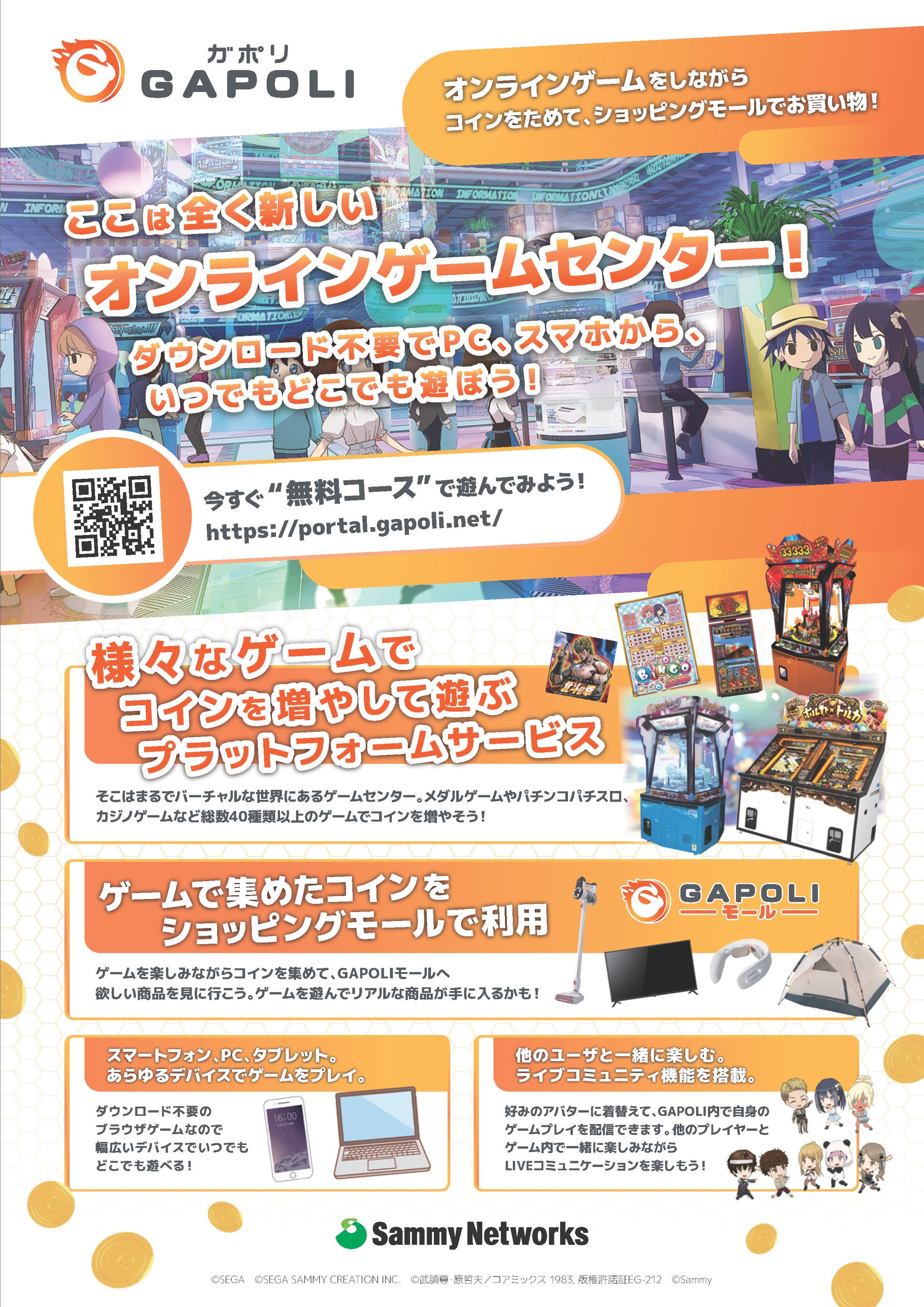 「GAPOLI」はブラウザゲームのため、PC、スマートフォン、タブレットと様々なデバイスでプレイ可能なオンラインゲームセンターサービスです。40種類以上のゲームで遊びながら共通のコインを貯め、貯めたコインはさらにゲームで遊ぶことはもちろん、リアルな商品の割引に使用できます。