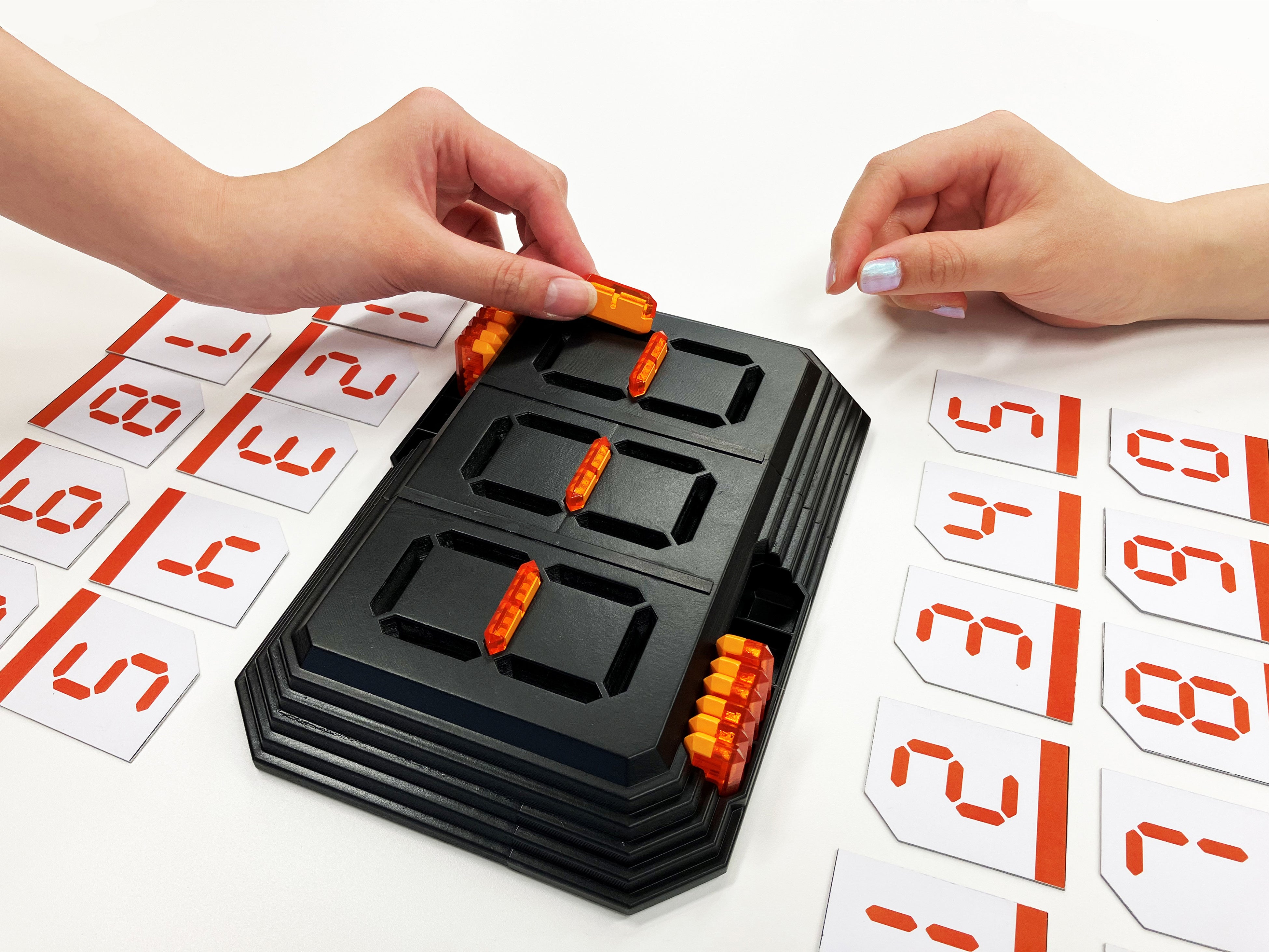 盤面に7種の数字を相手より先に完成させれば勝ちになる対戦ゲームです。本体を挟んで対峙し、セグパーツを「挿す」か「抜く」のいずれかを交代で行い、自分の手番に自分から見た方向で「0~9」の数字のうち7種の数字を先に完成した方が勝ちとなります。