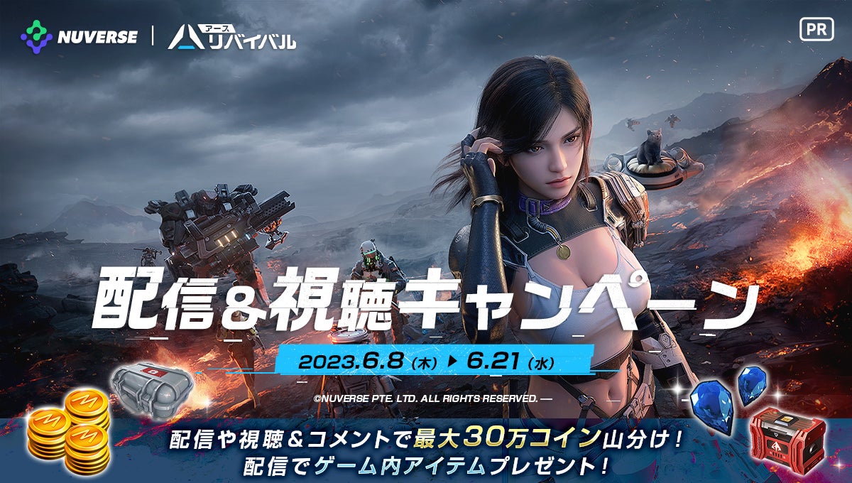 内容:スマートフォン1台で画面配信ができるゲーム配信プラットフォーム「Mirrativ(ミラティブ)」にて、「配信&視聴キャンペーン」を実施。Mirrativアプリ上で『アース:リバイバル』の配信や視聴、コメントをした方に、最大30万コインを山分けして配布、および累計配信日数に応じた以下のゲーム内アイテムを配布いたします。