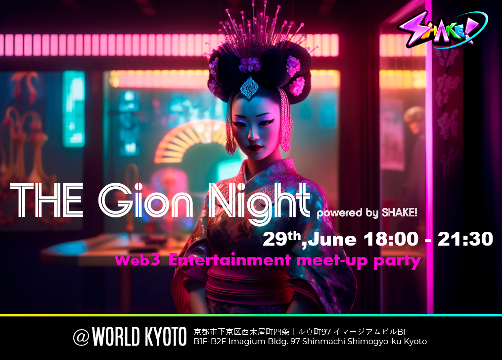 IVS Cryptoで開催される公式ゲームピッチコンテスト「SHAKE! KYOTO」(6月28日)に登壇したピッチファイナリストや、パブリッシャー、国内外投資家、インフルエンサー、エンターテイメント関係者が来場します。WORLD KYOTOに隣接した祇園の町から、京都の伝統文化の象徴である舞妓さんが皆様をお迎えし、熱いミートアップナイトを演出します。