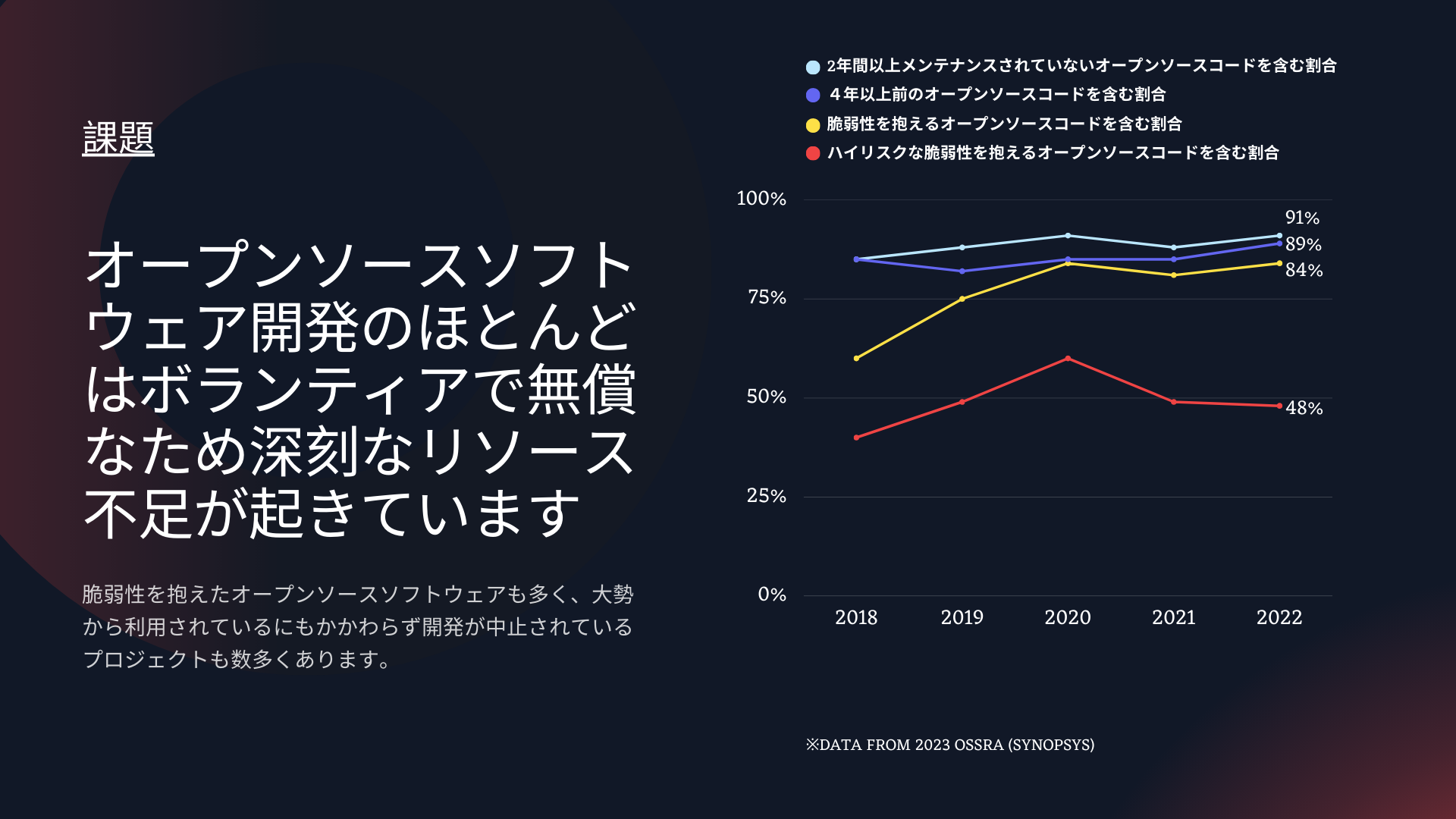 この深刻なリソース不足により、多くの利用があるにも関わらず開発を中止せざるを得なかったプロジェクトが数多くあります。利用が増えるに従いバグの数も増えるため、対処しきれていない問題も多く存在し、その結果全世界のソフトウェアの「脆弱性を抱えるオープンソースコードを含む割合」は 84% にも達してしまっています。「ハイリスクな脆弱性を抱えるオープンソースコードを含む割合」は 48% です (2023 Synopsys: OSSRA)。