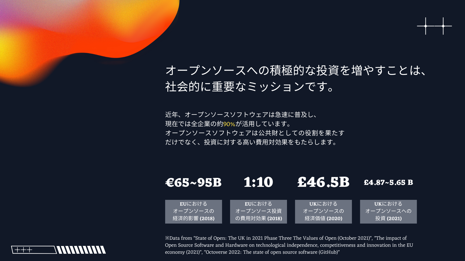 一方で、オープンソースソフトウェアに対する投資の費用対効果は高いです。欧州委員会は 2021 年にオープンソースの経済的影響を初めて調査し論文を発表しましたが、そこでは 2018 年 EU の GDP への累積ベースの貢献で 1:10 という高い成果が報告されています (2021 European Commision: The impact of Open Source Software and Hardware on technological independence, competitiveness and innovation in the EU economy) 。
