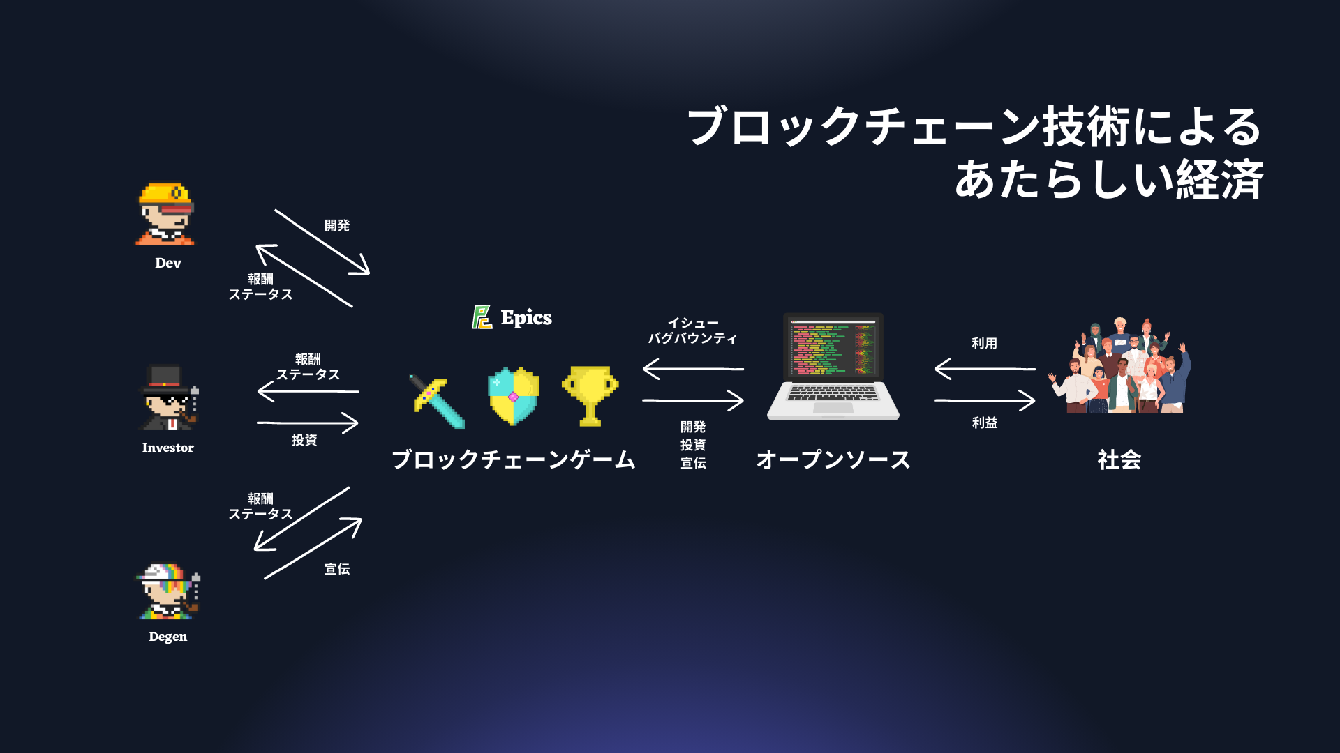 Epics の場合はオープンソースソフトウェア開発の深刻なリソース不足という実社会の問題に紐づいたゲームプラットフォームを開発することで、開発者・投資家・広報どの立場にもインセンティブがあり、それぞれが楽しさとインセンティブを求め実際に行動することでその社会問題が解決されていきます。