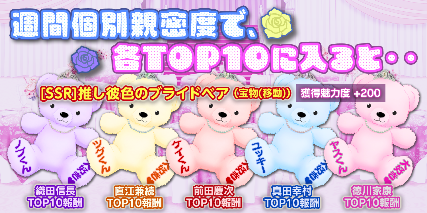 ★2023年6⽉12⽇(⽉)からイベントアイテムガチャで排出される、特別アイテム「[SSR]永遠の愛」を集めてclub恋下で使⽤すると…可愛すぎる移動アバター【純白ブライドベア】が貰えちゃう!キャスト別ランキングでは【推し彼色のブライドベア(全5種)】も登場♪こんな素敵なアバターいつGETするの?今でしょ!!
