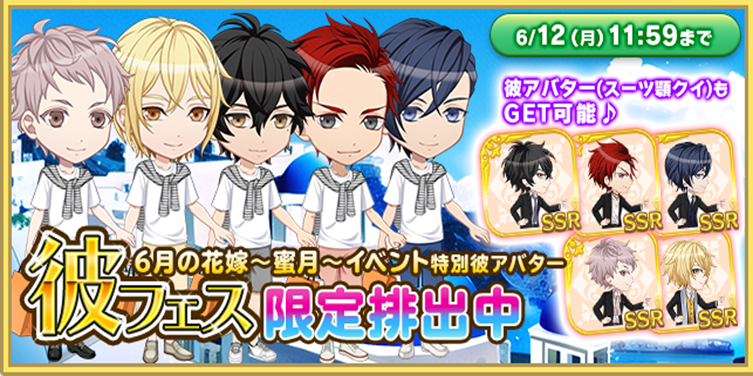 6月の花嫁~密月~イベント限定の彼アバターが新登場!甘~いハネムーンに浮かれているバカンス姿の彼等をGETできるのは今しかない♪