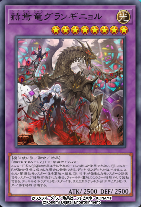 このカード名の①②の効果はそれぞれ1ターンに1度しか使用できない。①:このカードが融合召喚に成功した場合に発動できる。デッキ・EXデッキからレベル6以上の光・闇属性モンスター1体を墓地へ送る。②:相手が発動したモンスターの効果でモンスターが特殊召喚された場合、フィールド・墓地のこのカードを除外して発動できる。デッキから「ドラグマ」モンスター1体、またはEXデッキから「デスピア」モンスター1体を特殊召喚する。