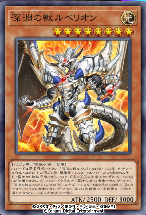 このカードは通常召喚できない。「深淵の獣ルベリオン」は1ターンに1度、自分フィールドのレベル6以上のドラゴン族・闇属性モンスター1体をリリースした場合のみ手札・墓地から特殊召喚できる。このカード名の①②の効果はそれぞれ1ターンに1度しか使用できない。①:このカードを手札から墓地へ送って発動できる。デッキから「深淵の獣ルベリオン」以外の「ビーステッド」モンスター1体を手札に加える。②:自分メインフェイズに発動できる。デッキから「烙印」永続魔法・永続罠カード1枚を選んで自分フィールドに表側表示で置く。