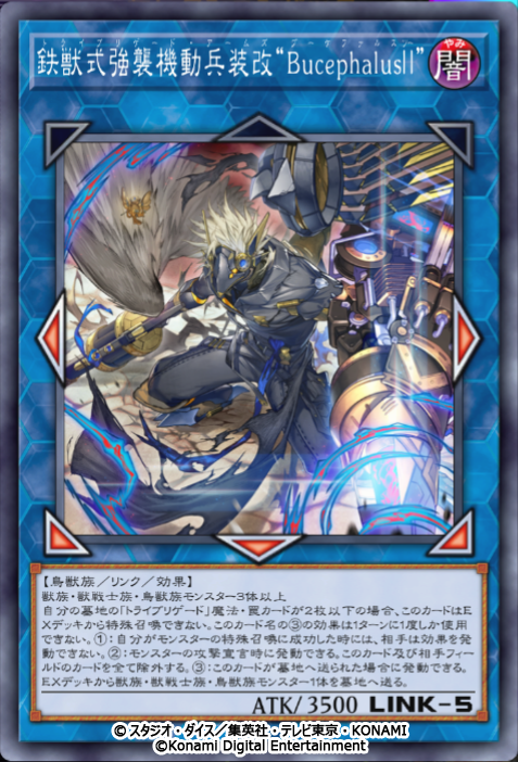 自分の墓地の「トライブリゲード」魔法・罠カードが2枚以下の場合、このカードはEXデッキから特殊召喚できない。このカード名の③の効果は1ターンに1度しか使用できない。①:自分がモンスターの特殊召喚に成功した時には、相手は効果を発動できない。②:モンスターの攻撃宣言時に発動できる。このカード及び相手フィールドのカードを全て除外する。③:このカードが墓地へ送られた場合に発動できる。EXデッキから獣族・獣戦士族・鳥獣族モンスター1体を墓地へ送る。