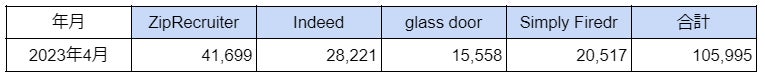 主要4サイト別の数値としては、「ZipRecruiter」が41,699件、「Indeed」が28,221件、「glass door」が15,558件、「Simply Fired」が20,517件となりました。