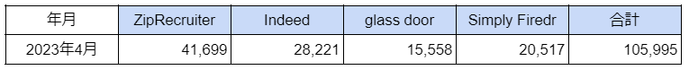主要4サイト別の数値としては、「ZipRecruiter」が41,699件、「Indeed」が28,221件、「glass door」が15,558件、「Simply Fired」が20,517件となりました。