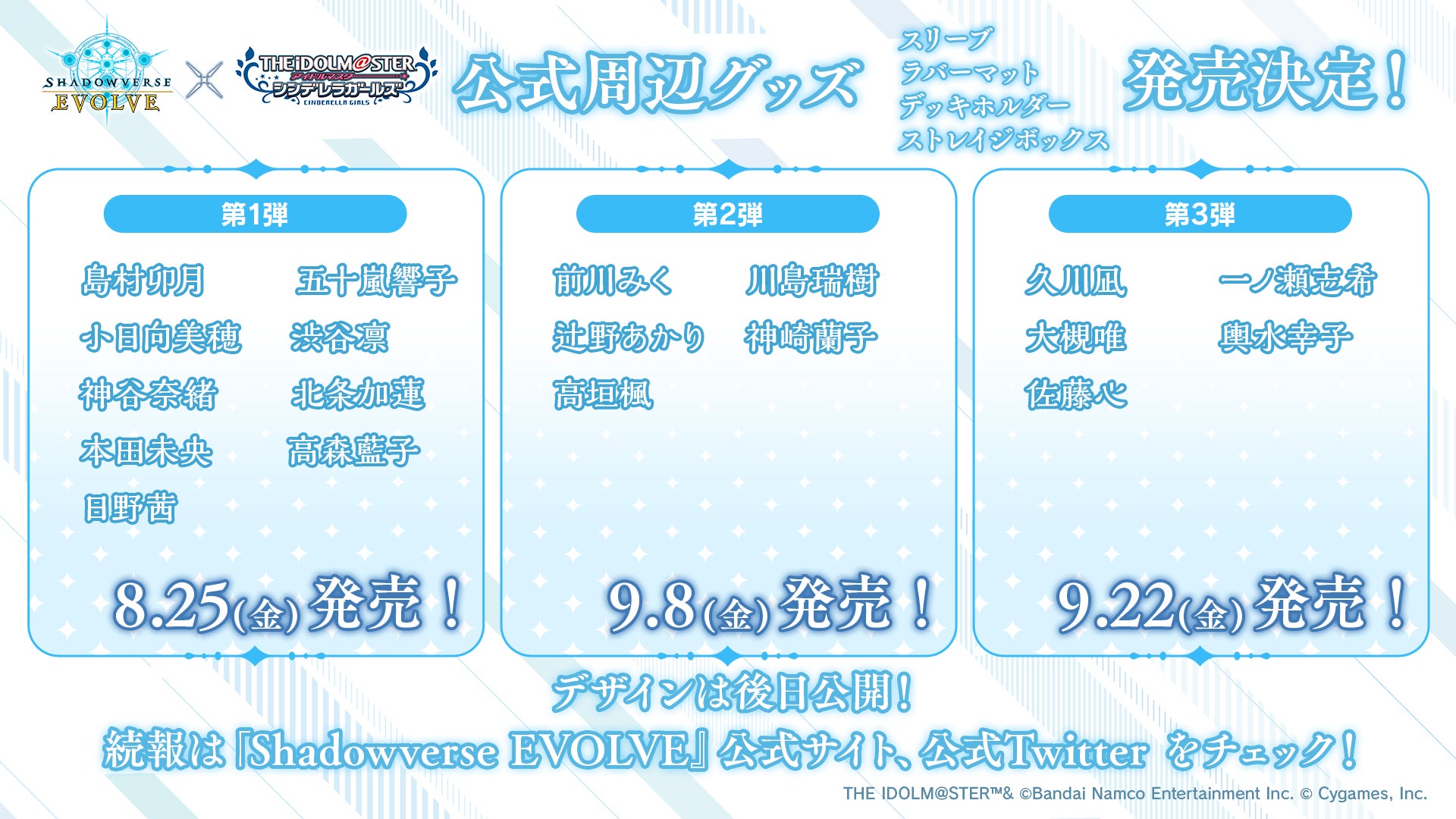 6月10日(土)に開催された、「THE IDOLM@STER CINDERELLA GIRLS 燿城夜祭 -かがやきよまつり-」DAY1にて、『Shadowverse EVOLVE』と『アイドルマスター シンデレラガールズ』のコラボ商品の発売情報を発表いたしました。