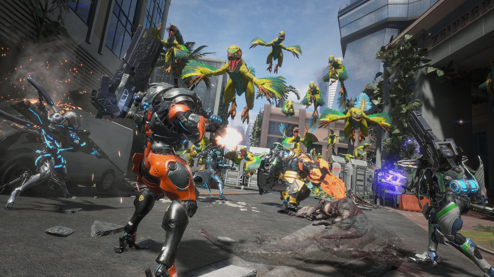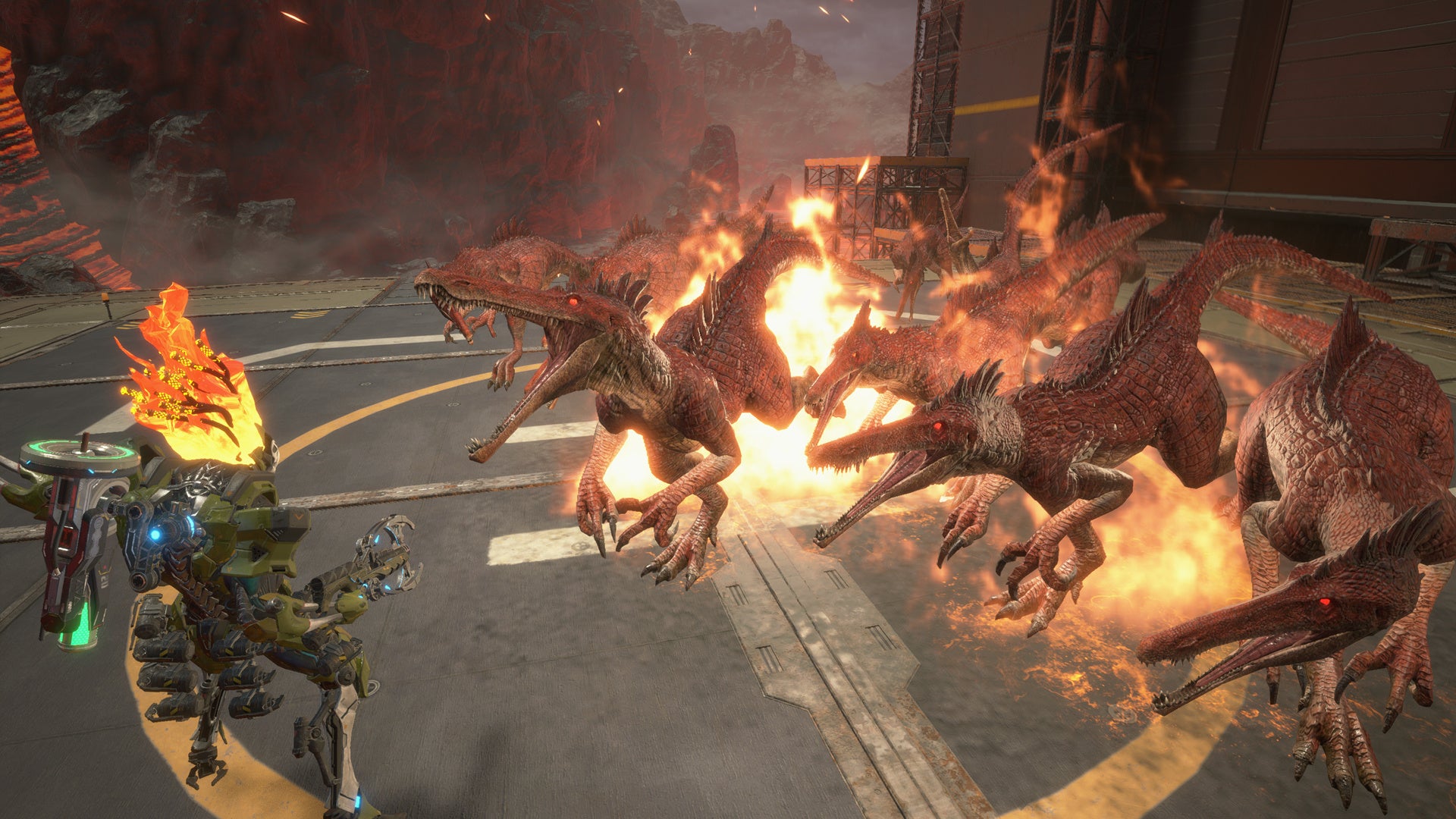 本作は、「ロール」という役割に特化した最新鋭パワードスーツ「エグゾスーツ」を纏い、圧倒的な量で押し寄せる「恐竜災害」に立ち向かう。メインモード「ディノサバイバル」は、5人のプレイヤーが1つのチームとなりチーム同士で競い合う5人vs5人の「対戦型PvE」で、どちらのチームが先に新世代AI「リヴァイアサン」から提示される全てのミッションをクリアするかを競う。時には対戦チームを直接攻撃して倒したり、時には共闘したりしながら、いち早くミッションを達成しよう。プレイヤーのゲーム進行状況に応じてミッションが変化するので、同じフィールド、同じミッションでも異なる体験が待っている。