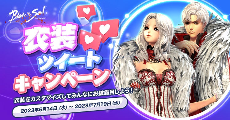 さらに公式Twitterアカウント(https://twitter.com/bns_official_jp )をフォローして、指定ハッシュタグ「#ブレイドアンドソウル」「#ブレソ衣装ツイート」と一緒に、衣装室を利用した衣装のスクリーンショットを投稿すると抽選で3名にBitCashをプレゼントします。