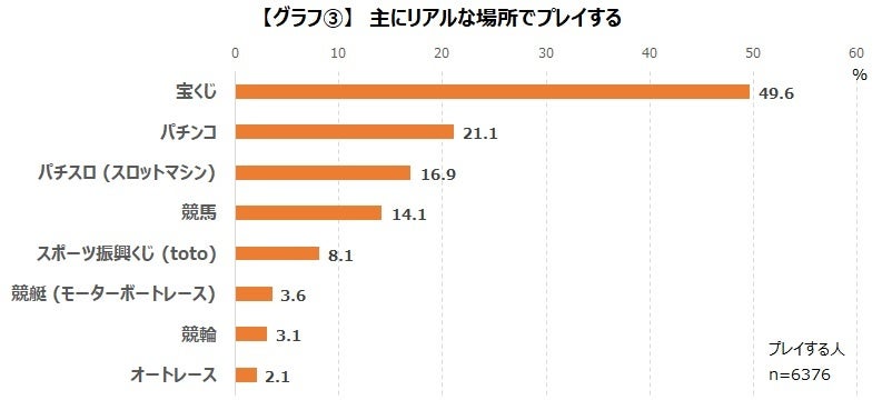 次に、「主にオフラインでプレイしているもの」について見ていきましょう。最も多かったのが「宝くじ」の49.6%、次いで「パチンコ」が21.1%、「パチスロ」が16.9%と続きます。【グラフ③】