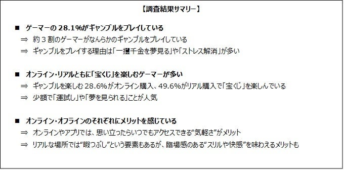 ギャンブルへの参加や遊技機のプレイは、一攫千金の夢やストレス解消という目的はもちろんですが、遊ぶことの手軽さや暇つぶしになること、スリルや興奮を求めてプレイするという動機は、ビデオゲームやアプリゲームを遊ぶ理由と共通している点が多く見られ、ゲーマーとギャンブルの親和性は比較的高いことがわかります。