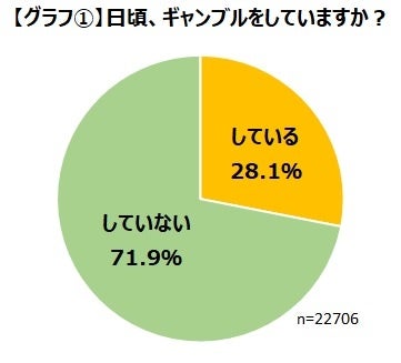 初めにゲーマーにギャンブルの体験を聞いてみると、28.1%のゲーマーが日頃から「宝くじ」などを含めたなんらかのギャンブルをプレイしていると答えました。【グラフ①】