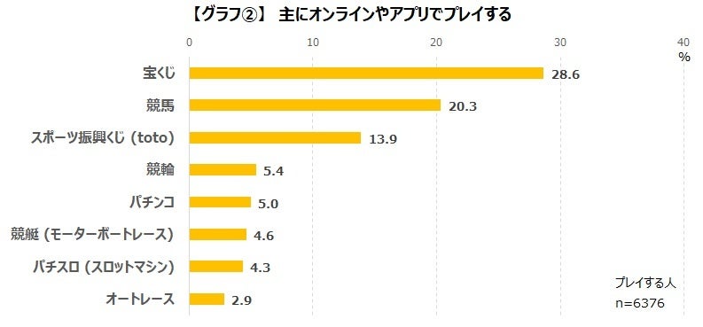 主にオンラインやアプリで参加できるものでは、最も多かったのは「宝くじ」の28.6%、次いで「競馬」の20.3%、「スポーツ振興くじ(toto)」の13.9%と続きます。【グラフ➁】
