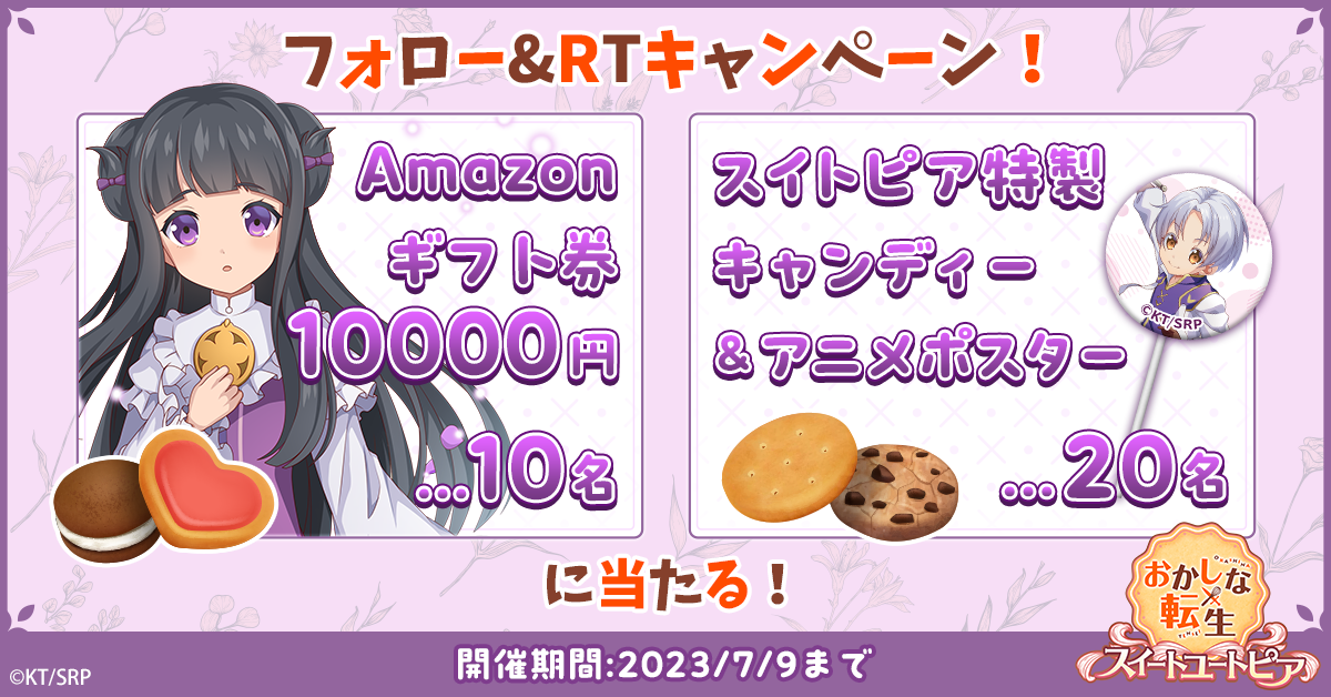 「おかしな転生 スイートユートピア」公式Twitterでは、フォロー&リツイートキャンペーンを実施中です。抽選で豪華賞品をプレゼントいたします。