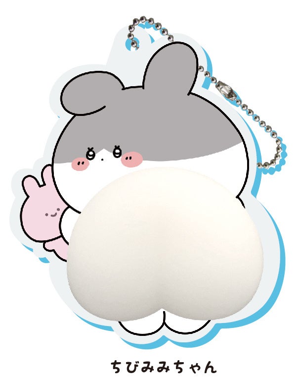 「あさみみちゃん」、「あねみみちゃん」、「ちびみみちゃん」のアクリルキーホルダー。スクイーズ素材のもちもちとしたおしりをリズムに合わせて叩くSNSで人気のシーンが再現できます。