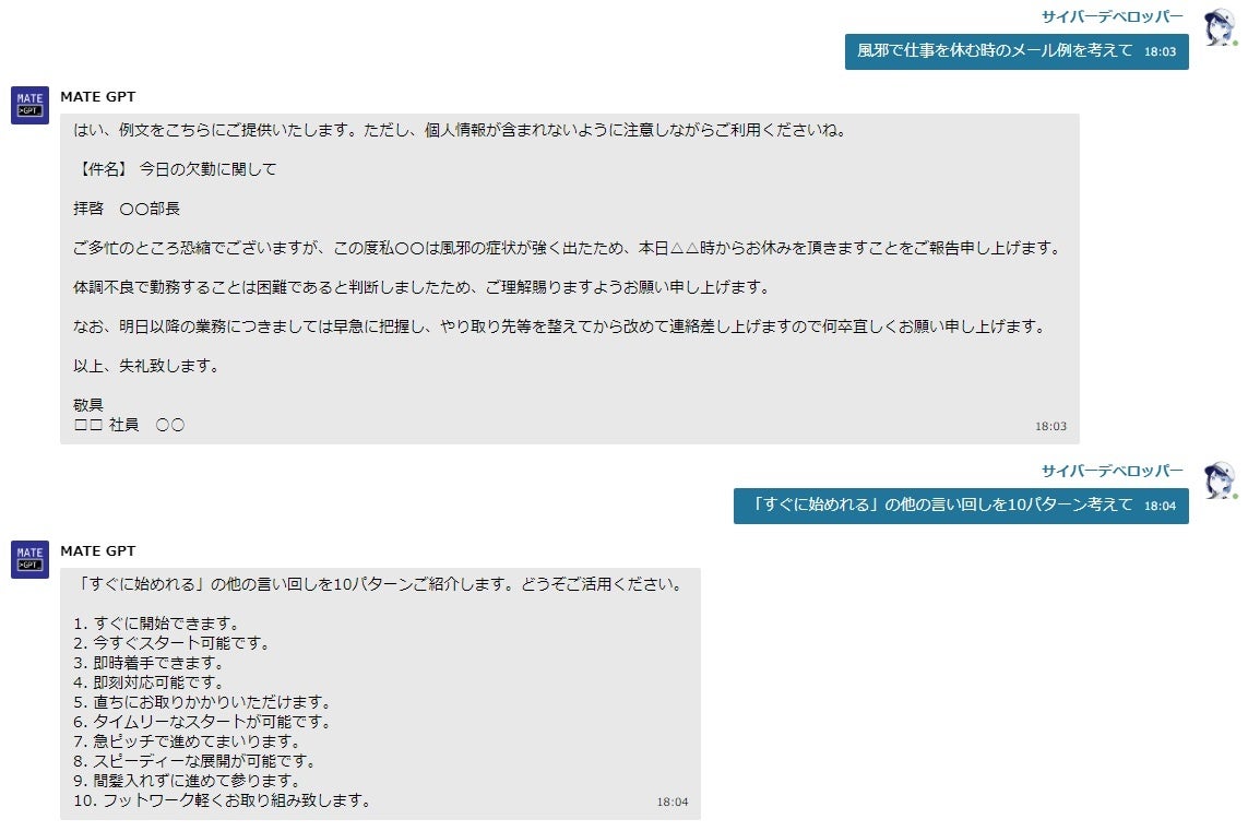 2023年5月16日には主に「言い回しの提案や文章作成」等の実用に特化したAIアシスタント型サイバーメイト「MATE GPT」の配信を開始し、好評を頂いております。