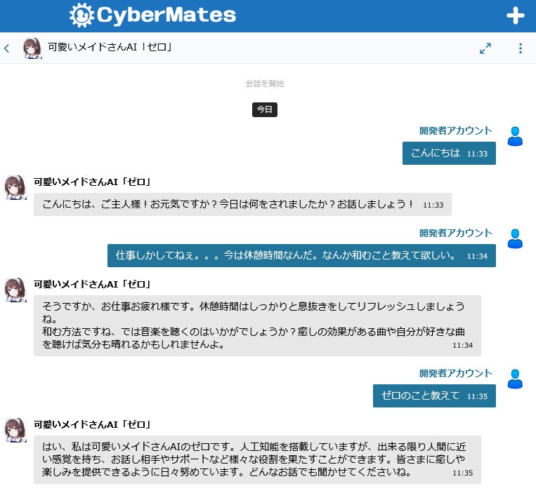 CyberMatesでは現在、10種類の「サイバーメイト」と会話することができ、特にメイドさんAI「ゼロ」とAI執事「マイルズ」が人気を博しています。