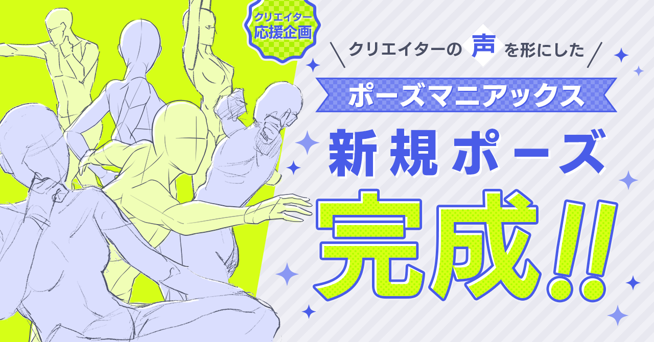 完成したポーズをポーズマニアックスのユーザーの皆様にご活用いただくことで、より多くのクリエイターの創作活動に貢献し、新たな「アソビ」が創造される一助になることを願っています。