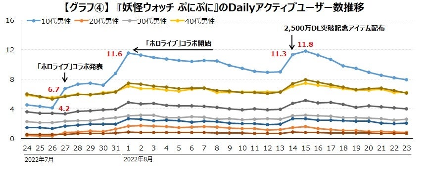 また、「ホロライブ」とのコラボは8月16日に終了しましたが、それと時期を合わせるように10代男性のユーザー数が減少しています。それでも、かつての中心ユーザーであった40代男女を上回るユーザー数を維持しており、「ホロライブ」とのコラボによって10代男性ユーザーが一定数定着したことがわかります。【グラフ④】