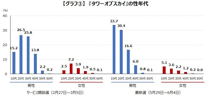 サービス開始週は20代と30代男性が多く、女性は20代が多くなっています。しかし、最新週のデータでは、10代男性の割合が倍増し、全体の3割を占めるまでになりました。20代男性も増加がみられますが、10代男性ほどではありません。女性も10代が増加しており、「ホロライブ」とのコラボで、若年層ユーザーが新規参入したことがわかります。【グラフ③】