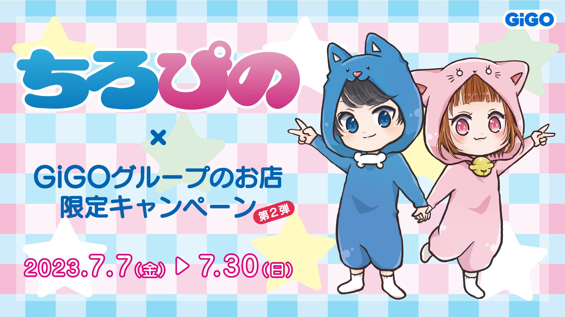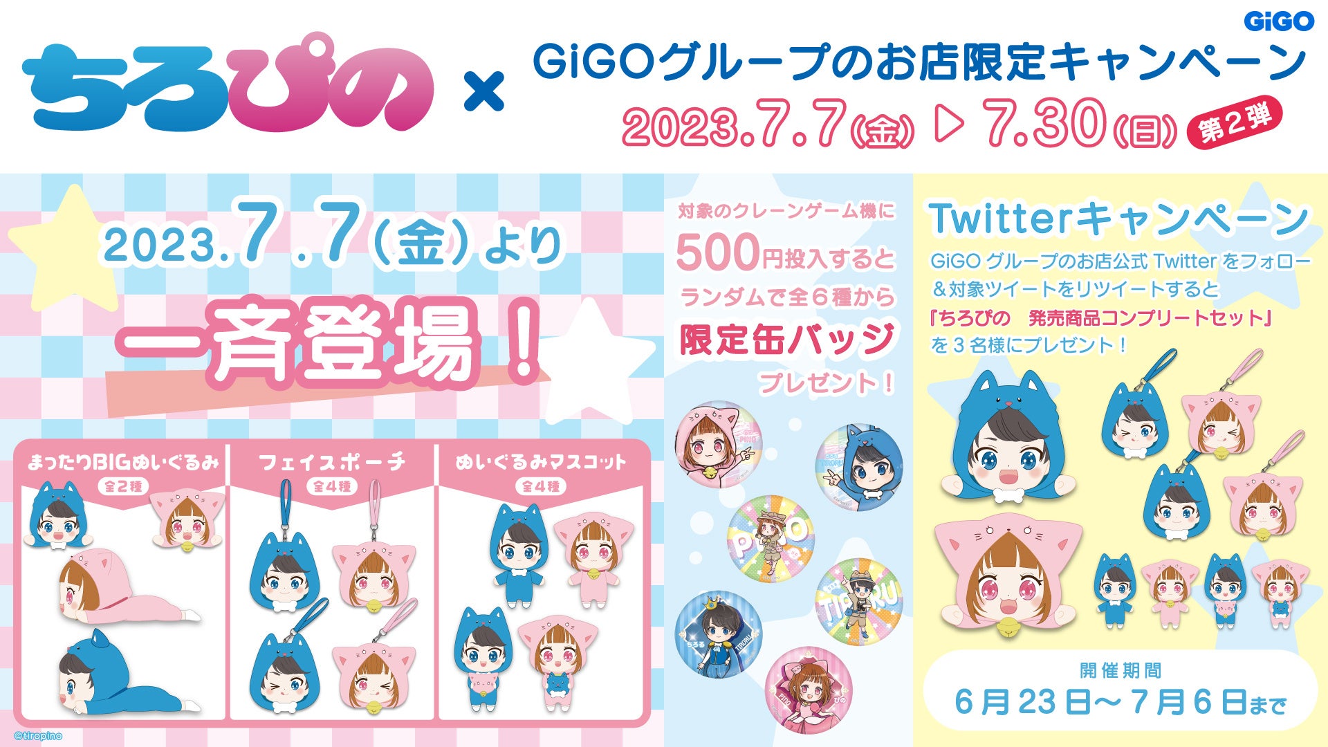 「ちろぴの」とのコラボレーション企画を記念してTwitterにてフォロー&リツイートキャンペーンを開催いたします。GiGOのお店公式アカウント(https://twitter.com/GENDA_GiGO )をフォローの上で、該当のツイートをリツイートされたお客さまの中から抽選で3名様に「発売商品(計10点)コンプリートセット」を進呈いたします。