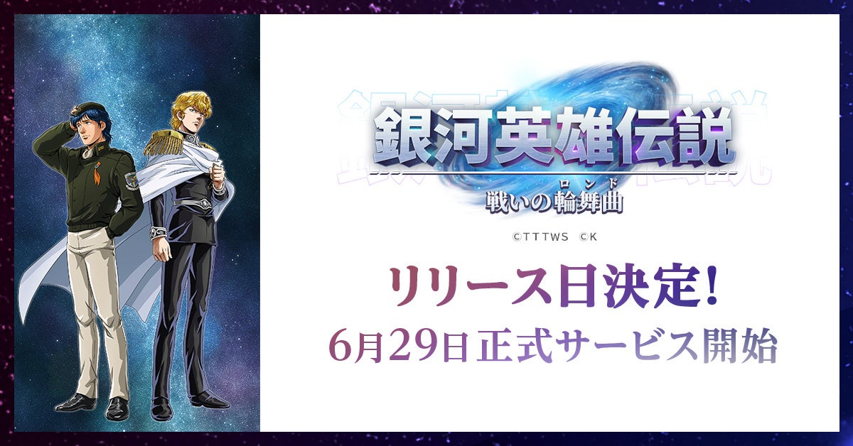 『銀河英雄伝説 戦いの輪舞曲』の正式サービス開始日が6月29日に決定いたしました。本作は銀河英雄伝説を題材にしたシミュレーションゲームです。ゲームでは、生産施設を発展させて戦力を強化し、戦いに参加して成果を上げ、軍人として高みを目指します。プレイヤーは「銀河帝国」「自由惑星同盟」のどちらかに所属しますが、キャラクターは所属に関わらず戦友として迎えて育成ができたり、両陣営の施設を発展させていくことができます。正式サービス開始を楽しみにお待ち下さい。