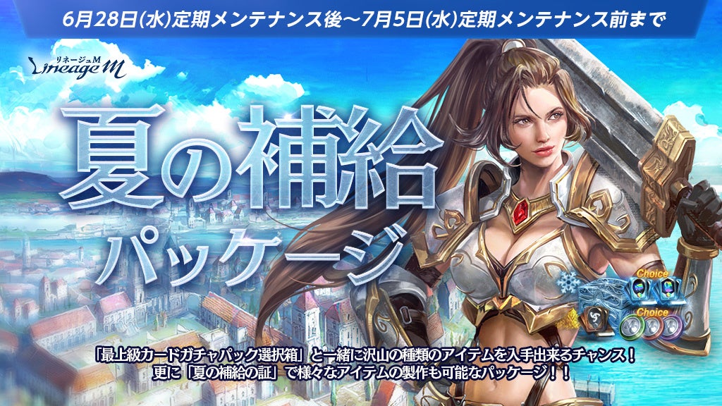 「最上級カードガチャパック選択箱」1個、「スキルカードガチャパック箱(イベント)」2個と一緒に、「上級祝福の粉箱」5個、「コイン選択箱」3個がセットになった「夏の補給パッケージ」が登場しました。