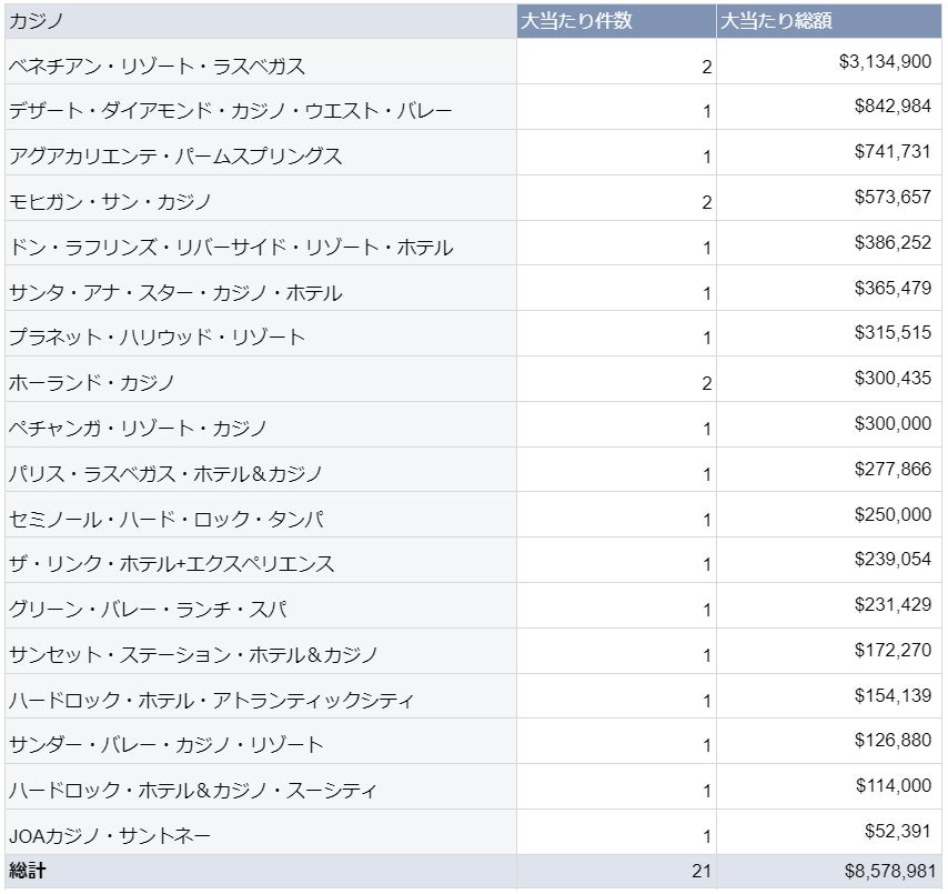 また大当たり回数で見ると、「ベネチアン・リゾート・ラスベガス」「モヒガン・サン・カジノ」「ホーランド・カジノ」で2件となっています。