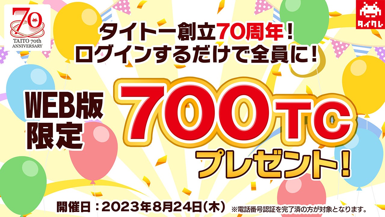 タイトー70周年記念として、8月24日(木)の1日限定で、WEB版のタイクレにログインしていただいた方全員に700TCをプレゼントいたします。