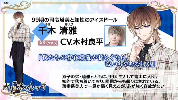 また、ゲーム内に登場する注目の「研究生」の99期生、「千木 清雅(CV.木村 良平)」、「千木琉雅(CV.石川 界人)」、「八代 朱里(CV.古川 慎)」、「住ノ江 政虎(CV.諏訪部 順一)」、「真里谷 忍(CV.増田 俊樹)」のキャラクターイラストと、演じる豪華声優陣を解禁しました。