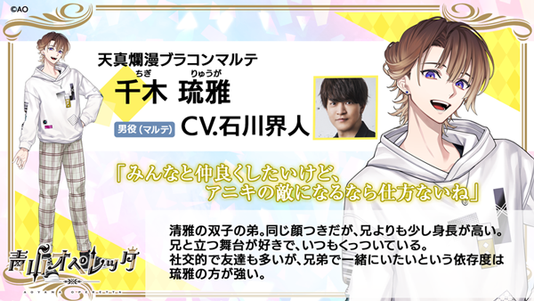 100期生で構成される劇団新チームである「ノーヴァ」のキャラクター達を演じるのは、実際の舞台でも活躍中の長江 崚行、大隅 勇太、大平 峻也、友常 勇気、中山 優貴をはじめ、ダンスロックバンド・DISH//のメンバーの矢部 昌暉の6名。さらに声優として活躍中の利根 健太朗が脇を固め、声優や俳優という枠に囚われない多様なキャスティングとなっています。