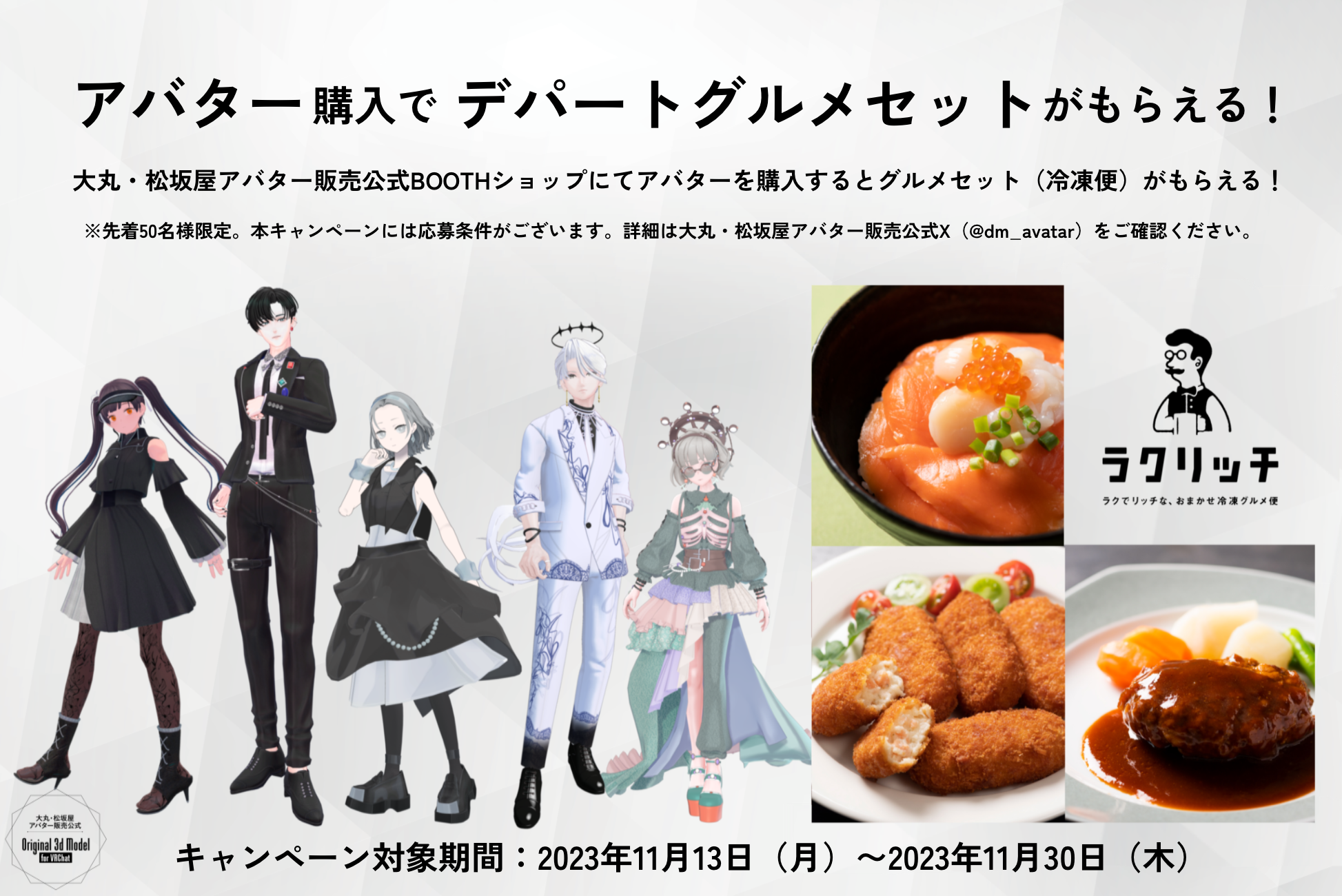 今回【大丸・松坂屋アバター販売公式BOOTHショップ】では、お買い上げのお客様のうち条件を満たした方先着50名様に、大丸松坂屋百貨店が展開する冷凍グルメ便「ラクリッチ」のグルメセットをプレゼントするキャンペーンを開催いたします。