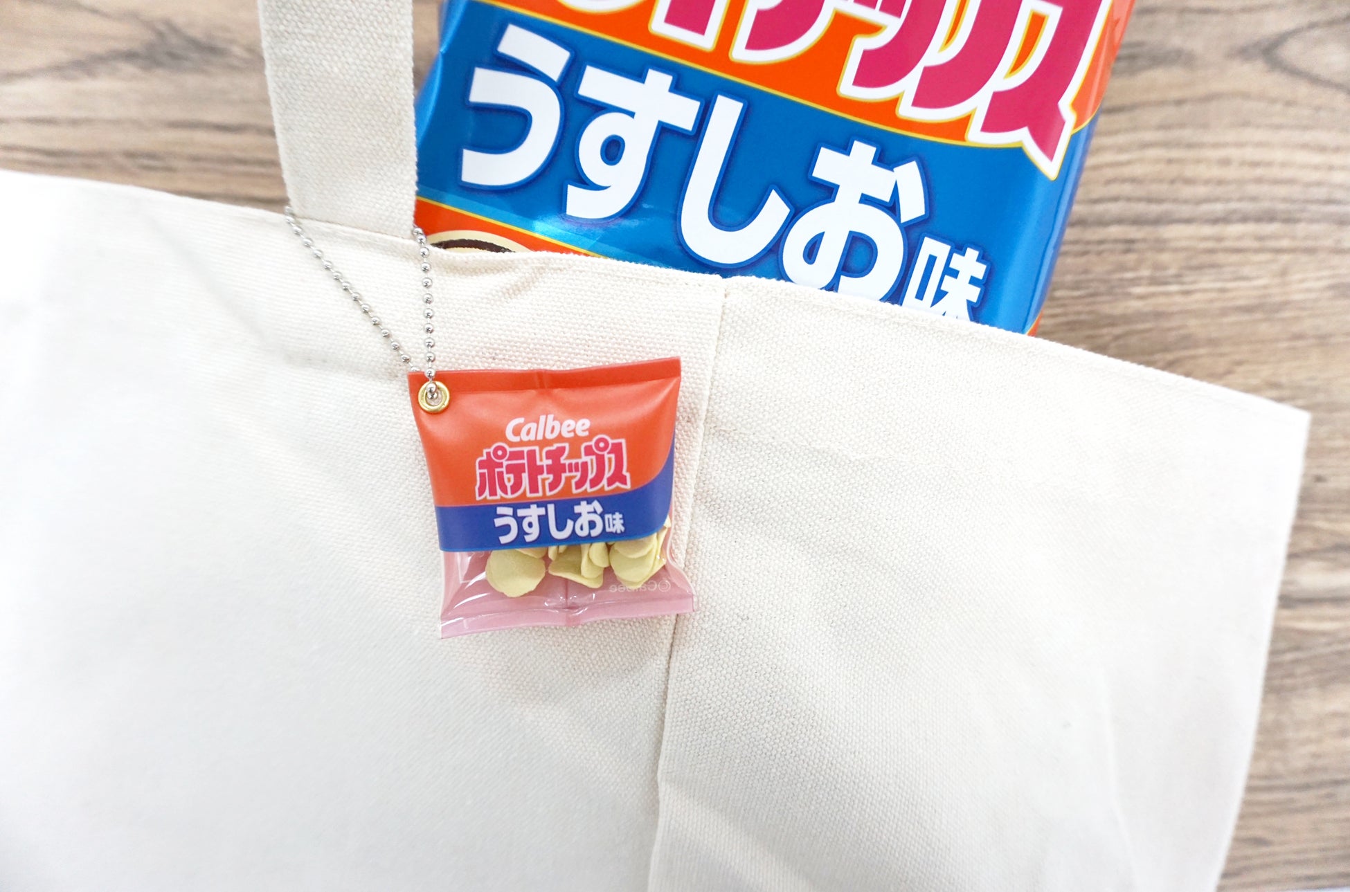 『カルビーポテトチップス』のパッケージがミニサイズになったマスコットボールチェーン。