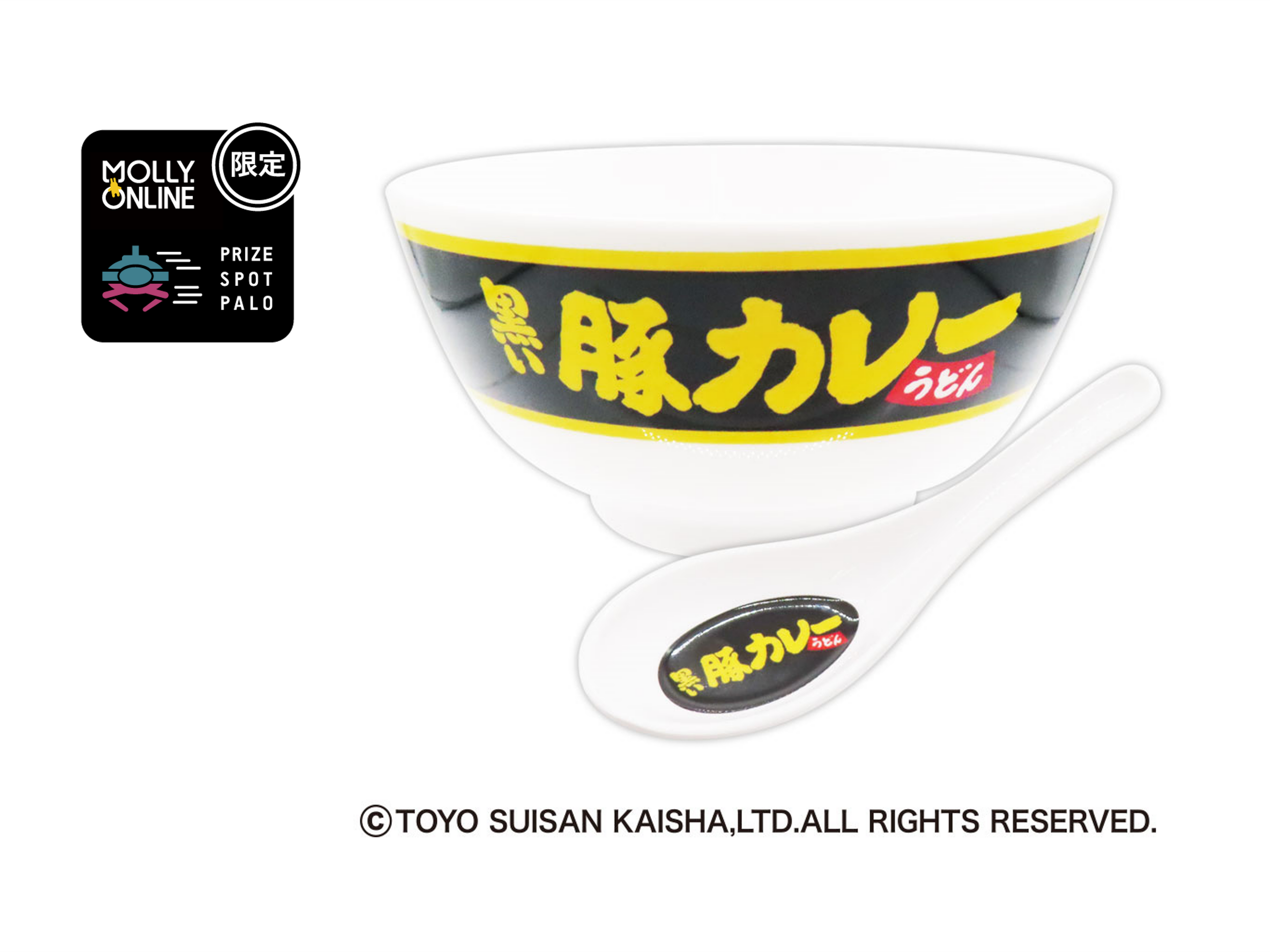 モーリーオンライン・PRIZE SPOT PALO限定の『黒い豚カレーうどん』のロゴがデザインされたどんぶりとれんげの食器セット。
