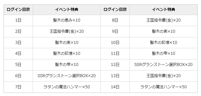 聖木の記憶×5 聖木の雫×5 聖木の実×5 王国指令書(金)×15 超越深淵入場券×5 撃滅戦5TSSR+防具選択BOX×1 100万ゴールドBOX×10 金の蝶×150 |