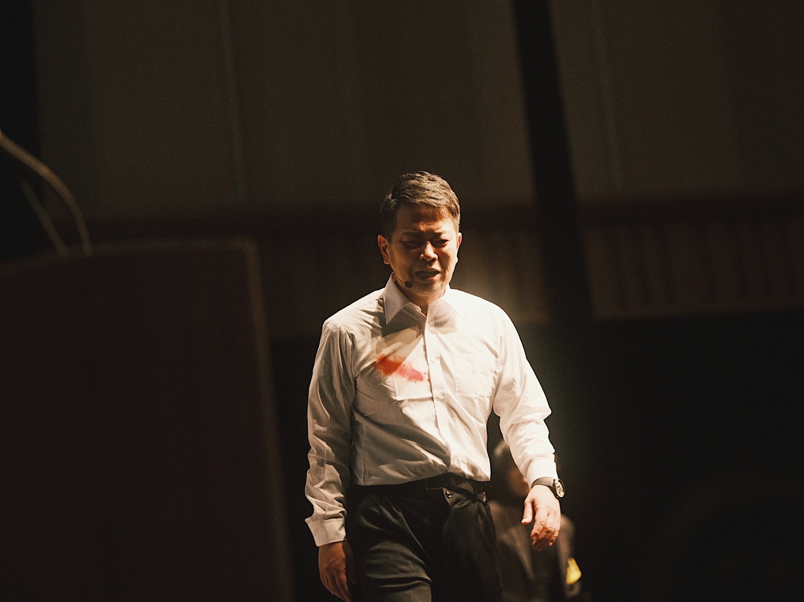 飯田が話を続けているなか、突如会場が暗転。明るくなると飯田が来賓席で倒れている姿を発見しました。騒然とする会場のなか、照らし出されたステージには、刑事役・宮迫博之が駆けつけます。