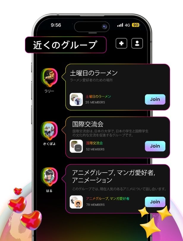 「近くのグループ」機能: この機能により、学生は様々な活動やイベント、ソーシャルグループを投稿・探索することができ、学生生活をより身近で魅力的なものにすることができます。イベントを企画したり、共通の話題で繋がったり、地図上に場所を投稿して新たな人に発見してもらったり、グループチャットに参加したりすることができます。利用者はお互いの場所を共有したり、グループごとで色々な一面を見せたりしていくことができます。