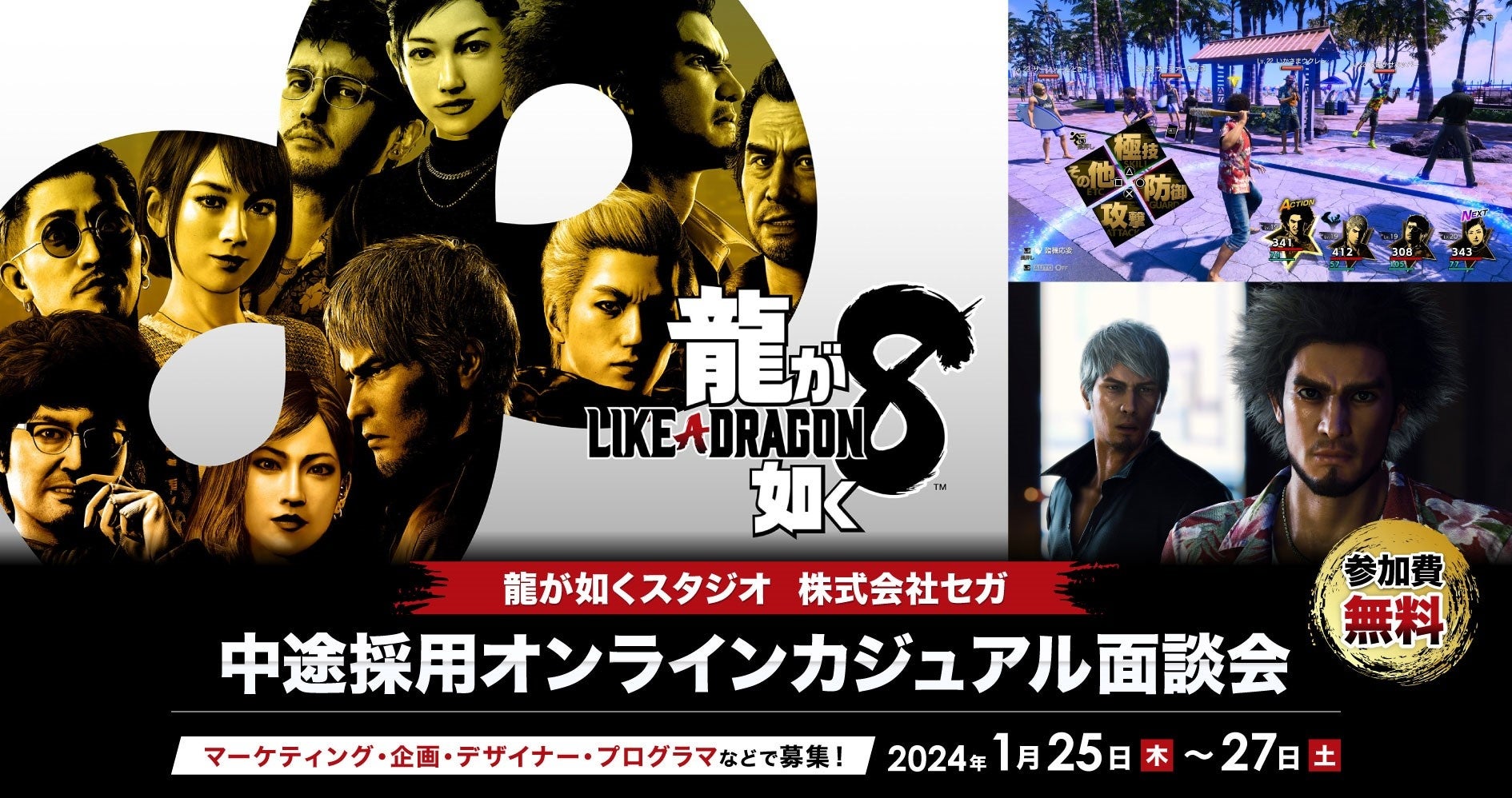 設立以来、アミューズメントマシンのメーカーとして発展し、数々の著名なタイトルの企画・開発を手掛けてきたセガ。数多くある代表作の中でも長年の人気を誇る『龍が如く』シリーズの最新作が2024年1月26日(金)に発売されます。1作目が発売されたのは2005年。その後シリーズ化され続編、外伝とヒット作を生み出し続けてきました。今回開催するカジュアル面談会では、今後も様々な展開を予定している「龍が如く」シリーズの次世代の担い手となる若手クリエイターや、コンテンツをより強化するための即戦力人材など、「龍が如くスタジオ」のコアメンバーを広く募集します。当日は、セガのプロデューサーやアートディレクター、デザイナー、採用担当者が参加します。「龍が如く」シリーズの制作体制や求める人物像などを直接聞くことができるまたとない機会です。まずはお話を聞くだけでもかまいません。壮大な世界観を持った本作品に携わってみませんか?ご興味のある方はぜひこの機会にご参加ください。