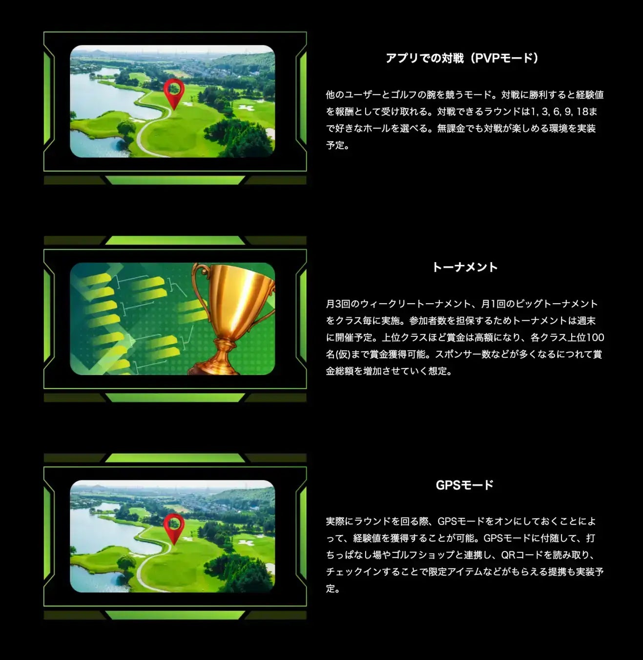 実際のラウンド時、GPSモードを有効にしておくことで経験値が獲得可能。打ちっぱなし場や室内ゴルフでの練習時にも経験値が獲得できる仕組みも実装予定。