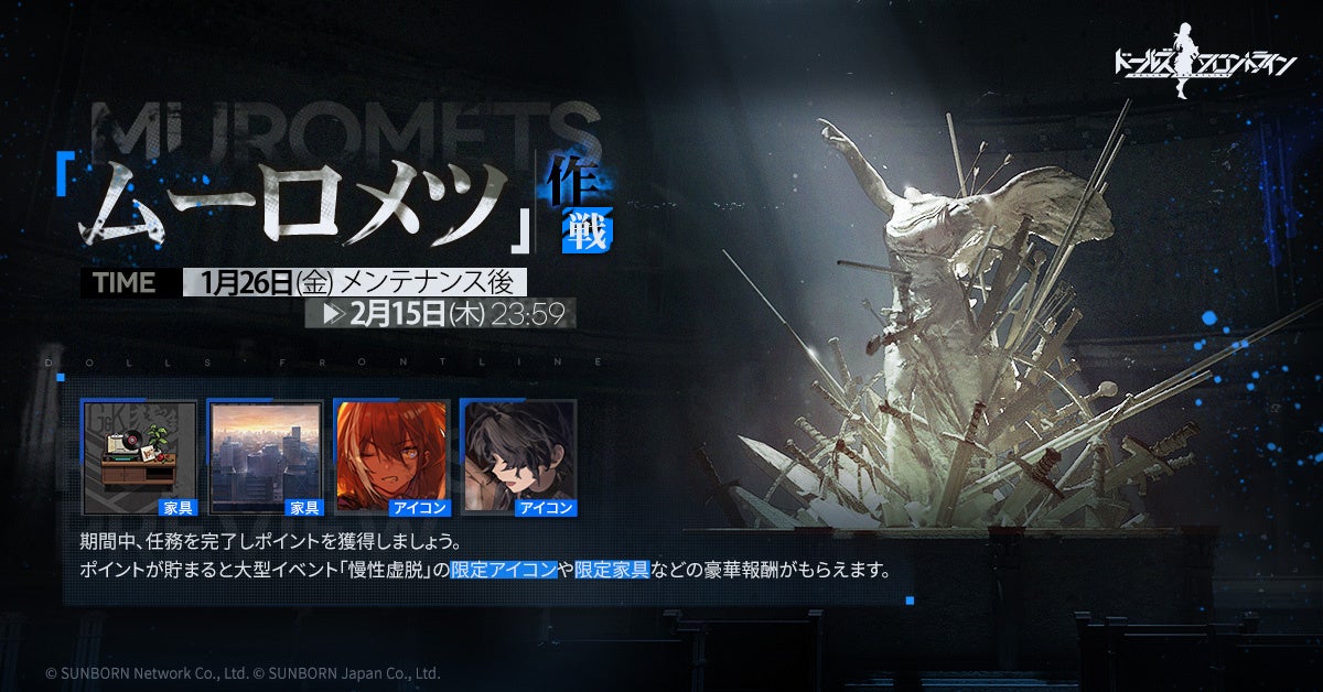 株式会社サンボーンジャパンは、スマホ向け戦略型シミュレーションゲーム『ドールズフロントライン(以下、「ドルフロ」)』において、1月26日(金)より限定の家具やアイテムが貰えるポイントイベント「ムーロメツ作戦」を開催いたします。