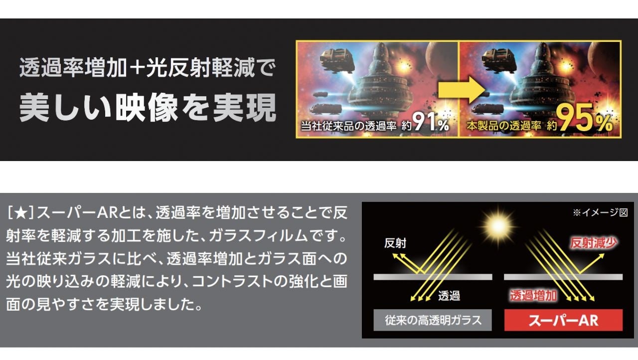 ■エッチングAR加工により透過率をアップ。ゲームプレイの際などに、光の映り込みに邪魔されずプレイすることができる超高透明タイプのガラスフィルムです。