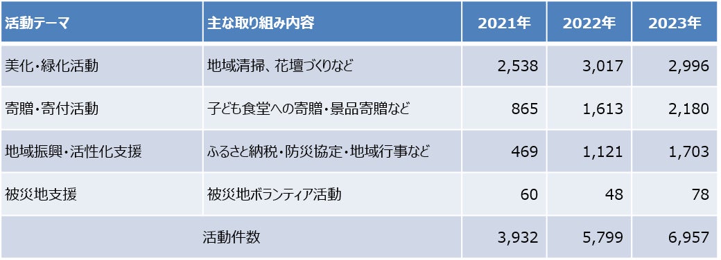 昨年(2023年)の年間活動件数は、合計6,957件(前年比120%)となりました。活動の内訳は、「美化・緑化活動」の2,996件が最も多く、次いで「寄贈・寄付活動」の2,180件、「地域振興・活性化支援」1,703件となりました。また、昨年は新たな取り組みとして、「魅力発見!三陸・常磐ものネットワーク」に参加し、全国37都道府県の子ども食堂125施設に対して、総額2,630,208円分の「三陸・常磐もの食材」を寄贈させていただきま