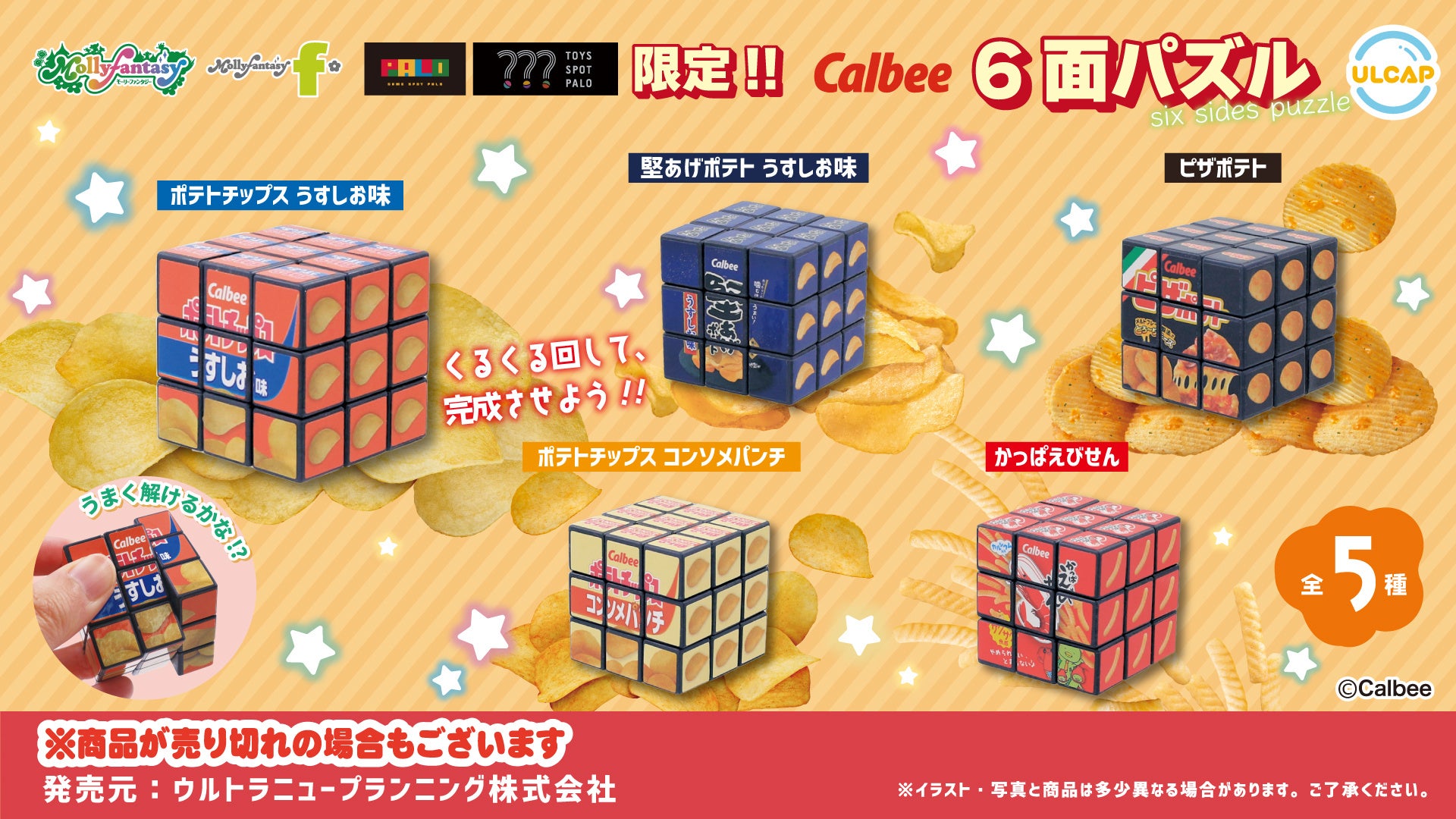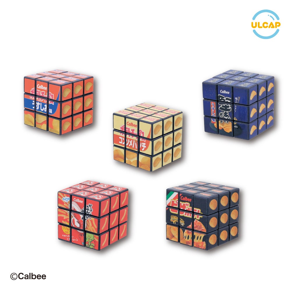 カルビーの「ポテトチップス」や「かっぱえびせん」、「堅あげポテト」のパッケージデザインがプリントされた手のひらサイズの6面キューブパズル。
