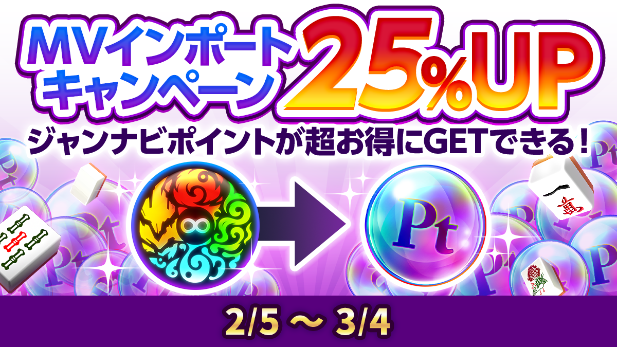 この度キャンペーン期間中にMVをジャンナビアプリ内にインポートを行った際、25%分のジャンナビポイントがお得に手に入るキャンペーンを開催します。